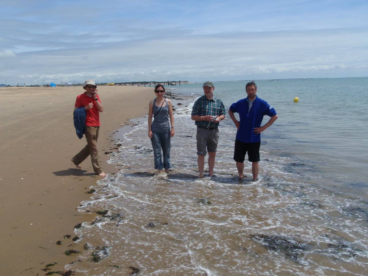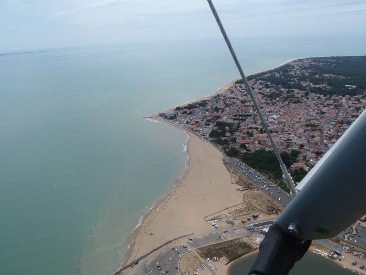 Mauleon, wo uns ein verlassener, aber sehr gepflegter Platz mit Asphaltpiste empfing. Nach kurzer Erfrischung war das Ziel La Tranche sur Mer nicht mehr weit und nur noch der frische Seitenwind machte uns etwas zu schaffen. An der Küste angekommen, diese etwas von oben betrachtend, landeten wir bei kräftigem Querwind auf der ungewöhnlichen 18er Piste. Lang genug war die Piste des Privatplatzes (mit Anmeldung) ja und eigentlich auch absolut unverwirbelt bei dem Wind, aber die Landung war dennoch nicht ohne. Aber alle kamen heil runter und es ging gleich Richtung nahe gelegener Strandpromenade, man weiß ja nie wie lang die Sonne noch scheinen sollte. In der sauber hergerichteten Strandbucht zumindest die Füße in den Atlantik stellen war schon Pflicht, bevor eines der Restaurants an der Uferpromenade einem das Verweilen erleichterte. Dahinter ist nur Meer und an der Seite die langgestrecke Insel Re.