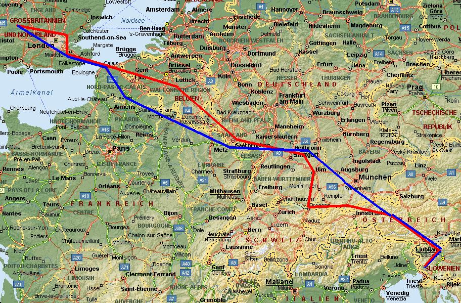 diesmal im Süden von London zurück über Lashenden nach Calais aufs Festland.