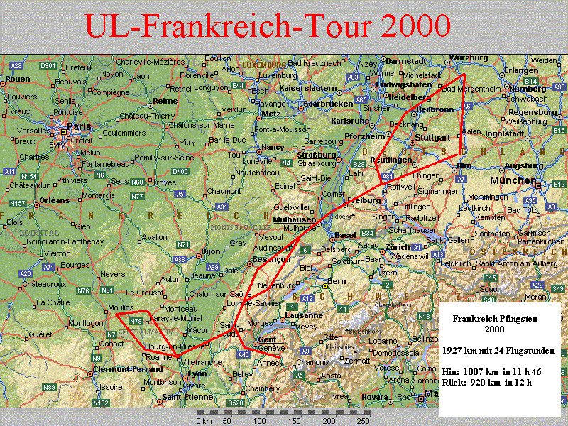 mickrige 2,10 Euro x 6 UL, also keine 15,-DM für alle zusammen, wir waren angenehm überrascht. Leider war auch hier das Restaurant geschlossen, aber in Selbstbedienung konnten wir uns bei der Flugschule versorgen. Einen Abstecher auf dem Rückflug zum UL-Platz nordöstlich von Roanne unmittelbar neben der Loire sollte nicht vergessen werden.
