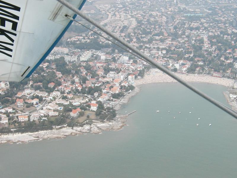 führte uns zur Hauptinsel d'Oleron mit Landung auf dem dortigen Flugplatz. Trotz unserer mangelhaften Französischkenntnisse bekamen wir neben Sprit und Kaffee noch einige wertvolle Hinweise für den Weiterflug an der Küste südlich La Rochelle bis in Höhe vom Bassin de Arcachon. Ein herrlicher Flug immer entlang der Sanddünen und über die Girondemündung bis Andernos les Bains. Freundlich aufgenommen konnten wir das Trike gerade so in die niedrige Halle manövrieren. Derweil telefonierte die Flugleitung nach einer freien Unterkunft, ein nicht gerade einfaches Unterfangen Mitten in der Hochsaison. Mit zwei Leihfahrrädern ging es auf einer bestens präparierten ehemaligen Eisenbahnlinie als Fahrradwanderweg in das 20 km entfernte Domizil. Die perfekte Abwechslung zu dem ausgiebigen Flugtag. Etwas verschwitzt angesichts der ungewohnten Distanz konnte bei einer Pizza der Abend seine Ausklang finden. Nur die Uferpromenade mit Sonnenuntergang fehlte noch für einen grandiosen Sightseeingtrip. Zwei herrliche Stunden an der Küste nach Süden.