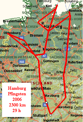 und dann fast senkrecht in die Höhe. Das letzte Trike hatte sich bei der Landung einen Platten zugezogen und natürlich gab es an so einem Platz in dieser Richtung keine Unterstützung. Nach einigen Telefonaten war klar, die einzig sinnvolle Lösung war ein Werkstattflug ins nahe Purkshof. Mit dem kompletten Rad im Gepäck machte sich ein Trike auf und fand die helfenden Hände im nahegelegenen Fliegerklub. Da kein passender Reifen aufzutreiben war, wurden Schlauch und Decke in einer Werkstatt besorgt und montiert. Zurück in Rostock-Laage hatten die anderen Fliegerkameraden, nach Sightseeing im zivilen Teil mit Touch and Go von so einigen großen Fliegern, alles startklar gemacht, denn wir hatten unsere Begleitcrew am Morgen nach Köthen bei Halle verabschiedet. Wie das halt so ist mit Pannen, immer am entferntesten Ort, aber dank der raschen Hilfe vor Ort kein Problem. Bei einem genussvollen Abendflug, ein Eurofighter machte noch mal ein paar Platzrunden vor unseren Augen am Startpunkt, ging es über die sehenswerte Mecklenburger Seenplatte der Elbe-Havelmündung entgegen. Hier war der Wasserstand noch recht hoch von den wochenlangen Regenfällen. Nach kurzem Tankstop in Stendal, in Laage gibt es keinen Sprit mehr für UL, war es ein ruhiger letzter Abschnitt bis nach Köthen. Wieder hatte die Bodencrew schon alles für ein Flugplatzabendessen vorbereitet und dank der Lokalität vor Ort war auch das Drumherum mit Abspülen und so weiter bestens arrangiert. Die Unterkunft war gerade in ausreichender Zahl vorhanden und so konnten die Zelte auch wieder getrost im Anhänger bleiben. Am Freitag mussten die ersten Flieger bereits die Heimreise antreten, so dass das gemeinsame Abschlussessen zu Mittag in Rosenthal Field bei Nürnberg statt fand.