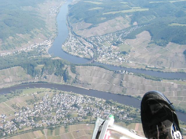 Am Dienstag, nachdem die Zelte abgebaut waren, ging es entlang des Moseltales mit den unzähligen Schleifen Richtung Koblenz. Der auf einem Plateau über der Mosel gelegene Platz hatte es an diesem Tag, bei den gegebenen Windverhältnissen, in sich. Der Wind kam über die Hangkante recht verwirbelt quer zur Bahn. Nicht nur bei der Landung, sondern auch beim Abflug wurden wir doch recht heftig durchgebeutelt. Insgesamt frischte der Wind nun deutlich auf und die Groundspeed auf dem GPS war über 100 km/h. An diesem Tag noch als angenehmen Rückenwind auf der Strecke, hatten wir auf der Rückreise gegen den Wind zu kämpfen.