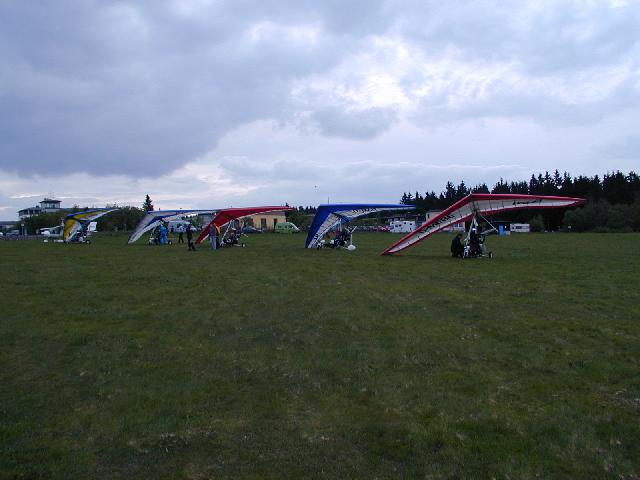 Der ehemalige Segelflugplatz wird nur noch von ULs benutzt. Er wird wegen der nach Osten ansteigenden Piste in der Regel nur in Richtung 06 angeflogen (Abflug entsprechend in Richtung 24). Unser Begleitfahrzeug mit Anhänger, das kurze Zeit später eintraf, hatte die notwendige Ausrüstung zum Zelten geladen und wir konnten unser Camp unter den Flächen der Trikes aufschlagen. Neben den Sanitäranlagen konnten wir auch die Kühlschrankvorräte (Getränke) des Vereinsheims nutzten. Der Sprit wurde per Kanister aus dem nahegelegenen Luxemburg bezogen (mit 85 ct deutlich günstiger) und auch zum Essen am Abend ging es in den kleinen Grenzort unterhalb des Platzes nach Echternach.