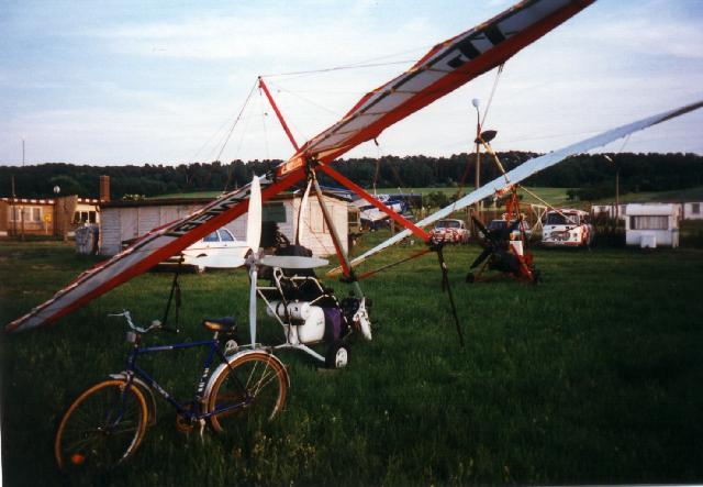 interrasanten Plätzen auf unserem weiteren Streckenverlauf. Das Spidertrike "schwebte" kurz vor Dienstschluß um 19 Uhr ein. Es hatte die letzten 60 km von Sömmerda in 30 Minuten zurückgelegt, mit der neuen XP12 von AirCreation kein größeres Problem, da sich die Trimmung des Flügels an der Basis befindet. Mit leicht ausgetrockneten Kehlen (der Kiosk am Platz war schon geschlossen) wurden wir nochmals auf eine "harte" Probe gestellt, denn der Weg in die Stadt führte auf einem Feldweg
