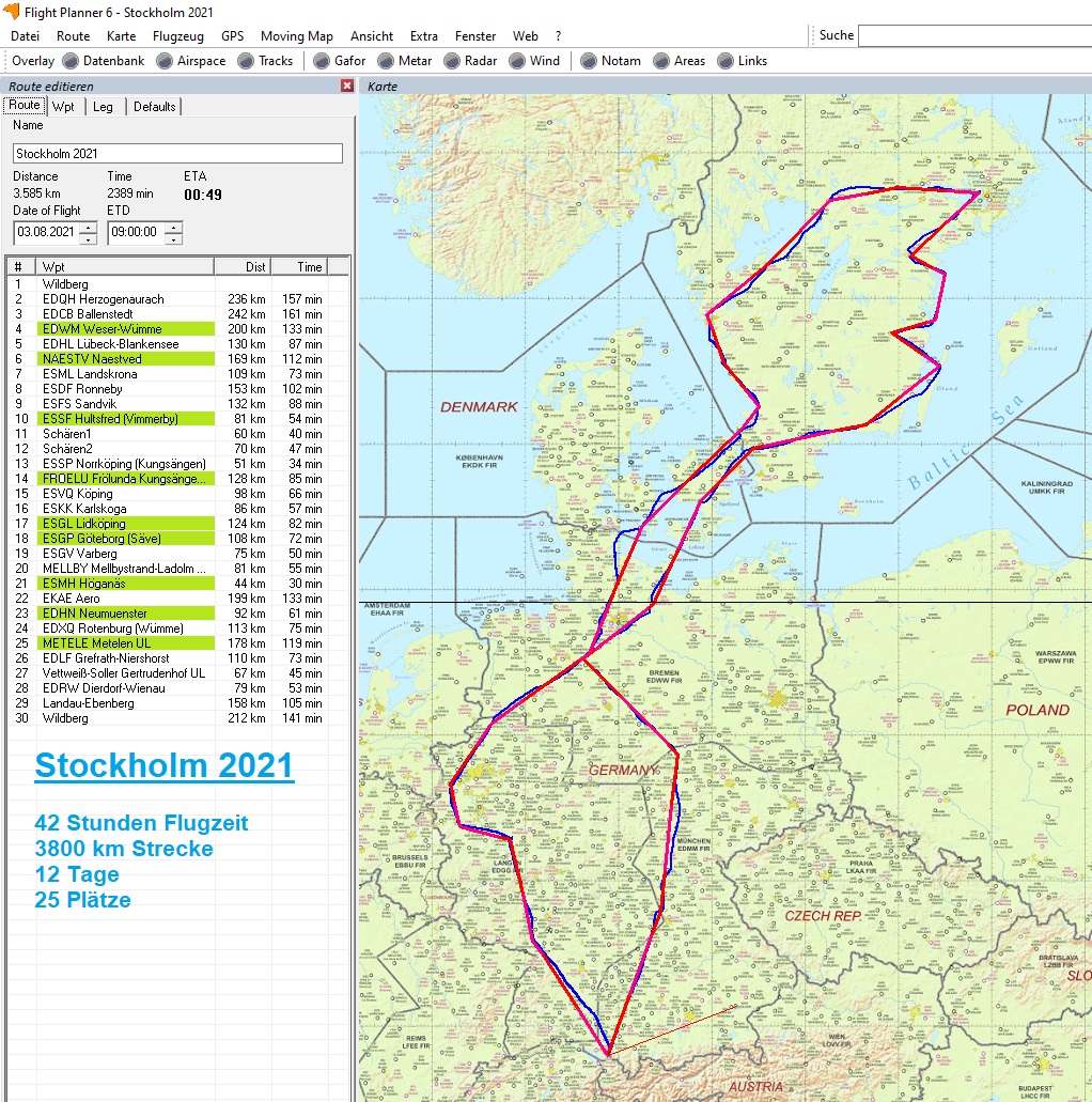 Lange schon lagen verschiedene Varianten für einen weiteren Besuch in Schweden in der Schublade und warteten nur darauf umgesetzt zu werden. Der zweite Sommer mit Corona sollte es richten. Ermutigt durch den Erfolg im letzten Jahr durch den Ausflug in die Hohe Tatra, hielten wir allen Widrigkeiten zum Trotz an unserer Planung nach Schweden fest. Als letzte Hiobsbotschaft kam mit den Auflagen für Dänemark, neu Hürden dazu. Mit Impfung und Maskenauflagen waren wir guter Dinge auch diese Hürden zu nehmen. Viele positive Rückmeldungen von Plätzen in Dänemark und Schweden wollten wir natürlich nicht enttäuschen, obwohl klar war, einige waren nur als Ausweichpunkte eingeplant. Das Prozedere mit Dänemark und Trikes war uns schon aus der Vergangenheit geläufig, dass die Gyros von einer anderen Stelle betreut werden, sei nur am Rande erwähnt. Nicht als selbstverständlich jedoch die erste Antwort von dort, „Ich habe die Unterlagen erhalten und werde sie gleich nach meinem Urlaub bearbeiten“. Und die Genehmigung war auch prompt nach seinem Urlaub per Mail im Postfach, Super. Da sind wir auch gleich beim richtigen Thema, Gyros. Die haben halt einen Verbrauch, wie ihre Gleiteigenschaften, 1 zu Stein. Also Flugplätze mit Tankstelle finden, auch unter der Woche. Und falls es mal nicht klappen sollte, müssen Kanisterlösungen herhalten. Deshalb waren neben drei Trikes nur 3 Gyros mit dabei, das begrenzt den logistischen Aufwand nicht nur beim Tanken etwas. Trotzdem habe ich recht spät in der Planung eine recht hilfreiche Seite von Hjelmco gefunden mit einer guten Übersicht zu UL91 Plätzen (besseres Mogas). Daneben war als Eckpunkt ein kleiner Platz in der Nähe