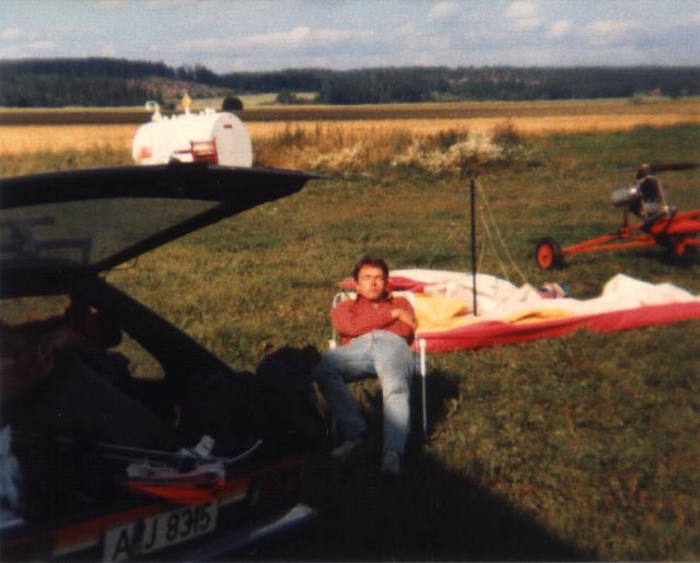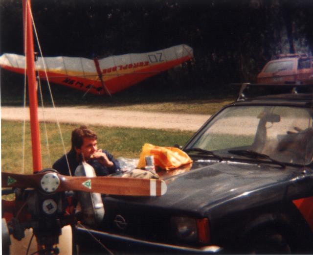 Beim Aufbauen dann merkte ich, daß mir eine steife Brise aus Westen zu schaffen machen würde. Der Start klappte einwandfrei, ich gewann schnell an Höhe, jedoch ab Baumwipfelhöhe merkte ich die eigentliche Stärke des Windes, gegen den ich zu kämpfen hatte. Ich flog ca. 15