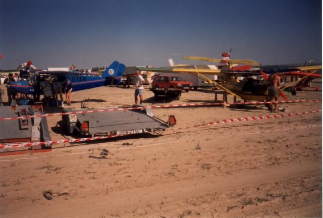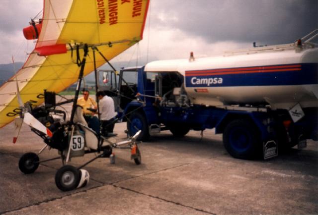 Im spanischen Landesinneren angekommen, war Schuß mit der Autoreise und ich baute das wieder intakte UL auf. Nach einer Platzrunde konnte ich zumindest die letzten 150 km wieder planmäßig durch die Luft zurücklegen und mich dabei gleich für die bevorstehende Meisterschaft an die Landschaft gewöhnen. Es war eine karste Hochebene, welche von terrassenförmig eingeschnittenen Tälern durchzogen war. Trotz des steinigen Untergrundes waren riesige Getreidefelder angelegt, welche jedoch schon abgeerntet waren und so gute Aussenlandemöglichkeiten boten.