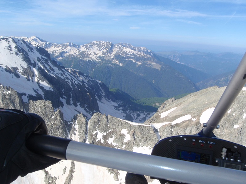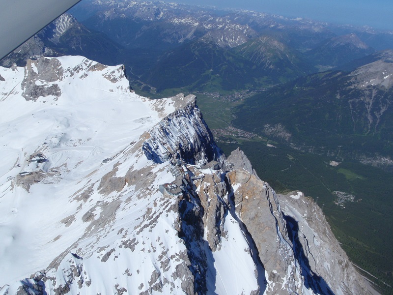 So konnte es am Pfingstsonntag bei absolut ruhigem Wetter gleich in der Früh mit einem gemütlichen einstündigen Steigflug von 400m auf 3000m bis zur Zugspitze starten. Wolkenloser Himmel über den Alpen, das gab uns die Möglichkeit, Deutschlands höchsten Berg in seiner vollen Pracht in verschiedenen Motiven festzuhalten. Der erste Höhepunkt konnte sich jedoch gar nicht so richtig setzten, bei dem beeindruckenden Panorama, das wir jetzt vor uns hatten, der Anflug auf den Alpenhauptkamm. Mit etwas kühleren Temperaturen als am Boden ging es bei gleichbleibender Höhe direkt nach Süden dem Ötztal entlang Richtung schneebedecktem Timmelsjoch. Die Gletscherwelt konnte ohne jegliche Beschwerden durch Wind oder dergleichen in vollen Zügen genossen werden. Anschließend musste jedoch die komfortable Höhe über dem Jaufenpass Richtung Sterzing zum nahegelegenen UL Platz bei Freienfeld abgebaut werden. Wir wurden gleich freundlich von den dortigen